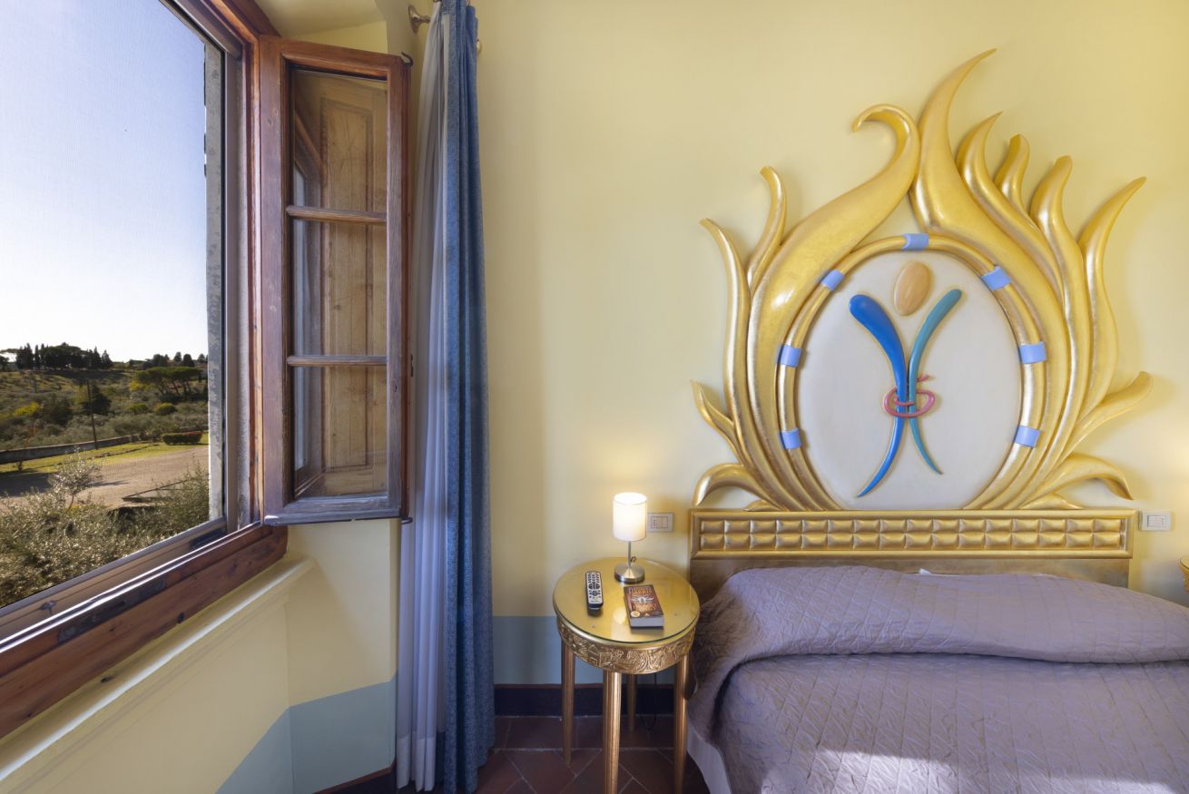 Una confortevole camera di 16 m² con vista sulle colline e arredata con le opere d’arte di Gabriele Nuzzarello. Letto matrimoniale, aria condizionata e bagno privato con doccia, la camera è perfetta per il soggiorno di una o due persone. Al suo interno è possibile trovare tutti i comfort per un soggiorno in totale relax.